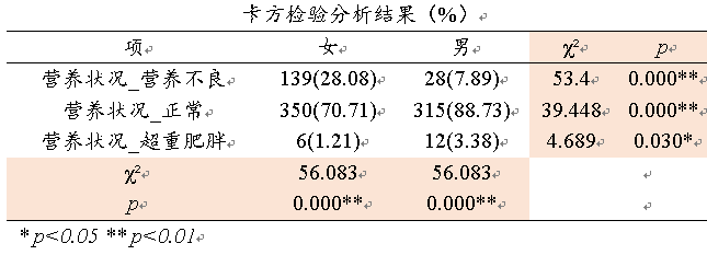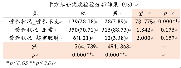 • 比如第2行的73.778,其为先筛选出‘营养状况’为‘营养不良’的样本群体,然后对‘性别’进行卡方拟合优度检验,类似地,第3行的1.842为筛选出‘营养状况’为‘正常’的样本群体,然后对‘性别’进行卡方拟合优度检验。第4行的2.000为筛选出‘营养状况’为‘超重肥胖’的样本群体,然后对‘性别’进行卡方拟合优度检验。