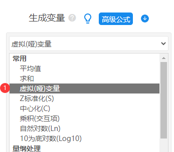 • 那么如何使用SPSSzero得到‘选项’呢?使用方式是SPSSzero 数据处理模块-> 生成变量功能->里面的‘虚拟(哑变量)’功能即可,如下图所示: