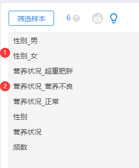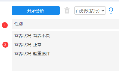 • 类似下图:研究‘营养状况’与‘性别’2个选项之间的差异关系,且使用加权数据格式,需要将‘加权项’即‘频数’放入对应的‘加权项[可选]’框里面即可。
