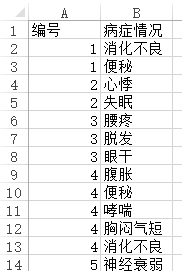 Apriori关联规则最为经典的案例是商场商品购物篮分析,但Apriori关联规则的应用远不于此,其也在医疗、金融等多个领域得到广泛应用,只要是用于研究类似于数据集一起出现情况,用于挖掘数据潜在特征组合时均可使用。本案例为某中医疾病探索分析,首先共收集1000名病人的病休特征,每名病人通常都有多种病状,比如心悸和神经衰弱容易同时出现,失眠与月经不调也容易同时出现等。最终整理出1000名病人共计3184种病症数据,部分数据如下图所示: