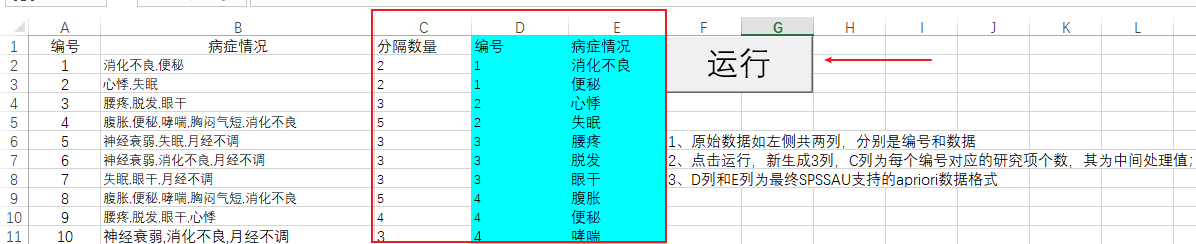 首先下载‘apriori 数据整理示例.xlsm’这个EXCEL宏文件,如果打开后EXCEL提示有代码运行则需要同意它。接着将数据A和B列整理好,此时点击‘运行’按钮,并且输入B列涉及的分隔符(本案例为英文逗号,当然也可以是其它的分隔符号比如斜杠等),即可得到C、D和E共3列数据。C列标识分隔数量,即比如编号为1的病人共有2种病症,编号为2的病人也有2种病症,其用于检验数据使用。D列和E列为最终有效的数据格式,将该2列复制放到新的EXCEL文件中,然后上传到SPSSzero 中进行分析即可。