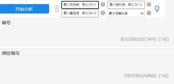 最大项集长度参数:通常建议设置较小的数字,便于聚焦性分析,否则可能出现分析结果中数据集合长度过长无法有效的聚焦到具体数据集中。