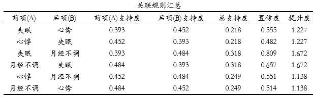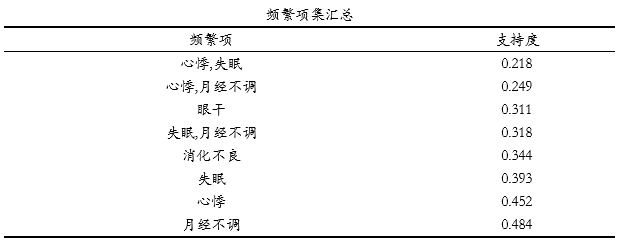 上表格展示满频繁集时超过2个数据时的关联规则情况,比如心悸和失眠这两项形成集合时,其分别的支持度,总支持度情况,置信度和提升度情况。便于整体分析关联情况。比如失眠和心悸,其展示二者分别的支持度,以及二者在一起时的总支持度。上表格来看,失眠和心悸均有着很高的出现概率(支持度分别是0.393和0.452),与此同时,二者的置信度为0.555,意味着出现失眠前提下再出现心悸的概率是55.5%,并且提升度为1.227>1,进一步说明二者有着强关联关系。