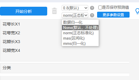 - SPSSzero 中,机器学习时均具有归一化参数值,并提供正态标准化/区间化/归一化等方式。其原理是针对具有完整数据的特征项X分别进行处理。比如下图中是针对编号为2~12共计11项的4个X分别进行处理。