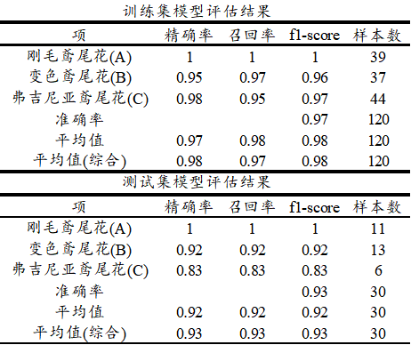 上表格中分别针对训练集和测试集,提供四个评估指标,分别是精确率、召回率、f1-scrore、准确率,以及平均指标和样本量指标等,如下表格说明: