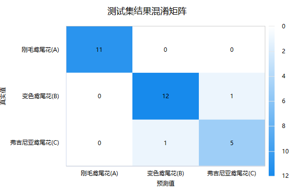 ‘混淆矩阵’时,右下三角对角线的值越大越好,其表示预测值和真实值完全一致。本测试数据中有2个样本被判断类别出错,整体模型较优。