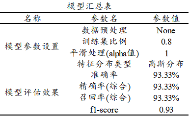 最后针对模型汇总表,其展示构建朴素贝叶斯模型各项参数设置,上表格中单独有输出平滑处理alpha值,当alpha=1.0时,称作Laplace平滑,当0