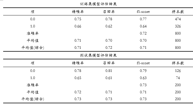 上表格中分别针对训练集和测试集,提供四个评估指标,分别是精确率、召回率、f1-scrore、准确率,以及平均指标和样本量指标等,整体来看,模型效果较差,因为无论是训练集还是测试集,F1-score值均约高于0.7而已,其它指标比如精确率或者召回率指标,均低于0.8。