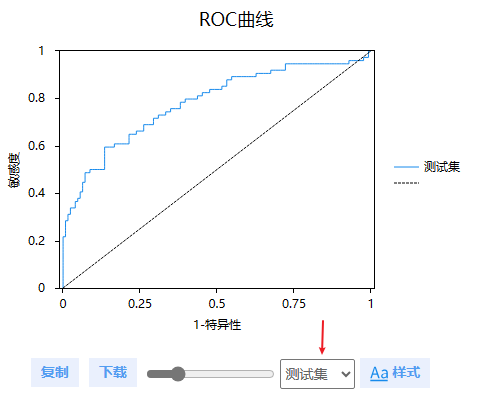 ROC曲线时,可切换测试集或者训练集,查看对应的ROC曲线。需要注意的是,如果非二分类(即Y的不同数字个数大于2时),此时不会输出AUC指标或ROC曲线。研究者可自行结合保存预测值进行构造ROC曲线等。