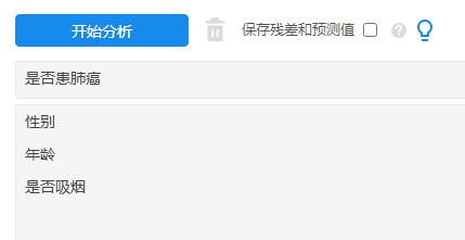 本例子中研究X对于Y的差异;X分别为性别(男),年龄和是否吸烟,Y为是否患肺癌。放置如下: