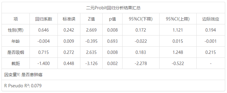从上表可知,将性别, 年龄, 是否吸烟共3项为自变量,而将是否患肺癌作为因变量进行二元Probit回归分析,从上表可以看出,模型伪R 2值(Pseudo R 2)为0.079,意味着性别, 年龄, 是否吸烟可以解释是否患肺癌的7.9%变化原因。从上表可知:模型公式为:Probit(p)=-1.400 + 0.646性别(男)-0.004年龄 + 0.715是否吸烟(其中p* 代表是否患肺癌为肺癌 的概率)。最终具体分析可知: