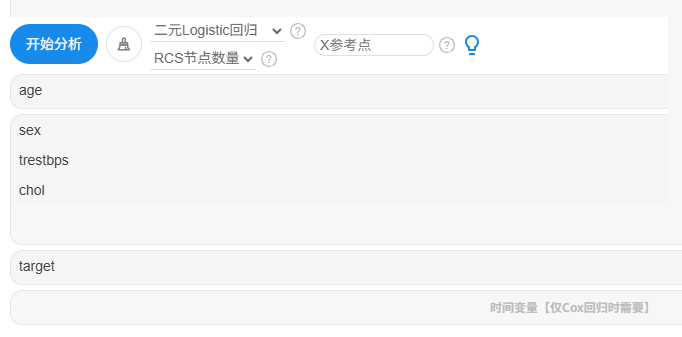 当前研究‘是否心脏病’的非线性关系,使用年龄age作为核心研究变量,因变量Y(target)为是否患病。共有3个协变量,分别是性别、静息血压和胆固醇。由于因变量target为是否患病,其为01二分变量,因此选择二元Logistic回归。X参考点不设置即默认为age的中位数值作为参考点。RCS节点数量默认为4,如下图所示: