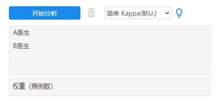 - 除此之外,如果希望对比2项以上的一致性,比如3个医生的诊断一致性,此时应该使用fleiss Kappa,下拉框选中该参数即可。