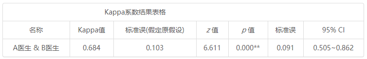从上表格可以看出,A医生和B医生对于50个病例MRI检验结果的一致性水平情况。MRI诊断分为三级分别是轻度,中度和生度。使用SPSSzero进行分析,从上表可以看到,检验结果呈现出显著性(z =6.611,p =0.00 <0.01),意味着Kappa系数值明显偏差0,说明具有一定的一致性水平;具体上看,Kappa系数值为0.684,介于0.6~0.8之间,意味着一致性水平较强;说明A医生和B医生对于MRI检查诊断结论上有着较强的吻合性。