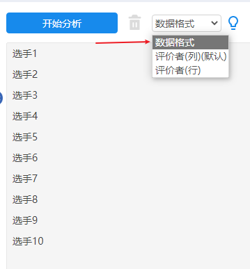 • 如果数据格式为一列表示一个评价者,那么就可以使用评价者(列)格式;反之如果一行表示一个评价者,此时应该使用评价者(行)格式。请结合上传数据格式进行选择使用即可。绝大多数情况下为一列表示一个评价者,即按列格式。