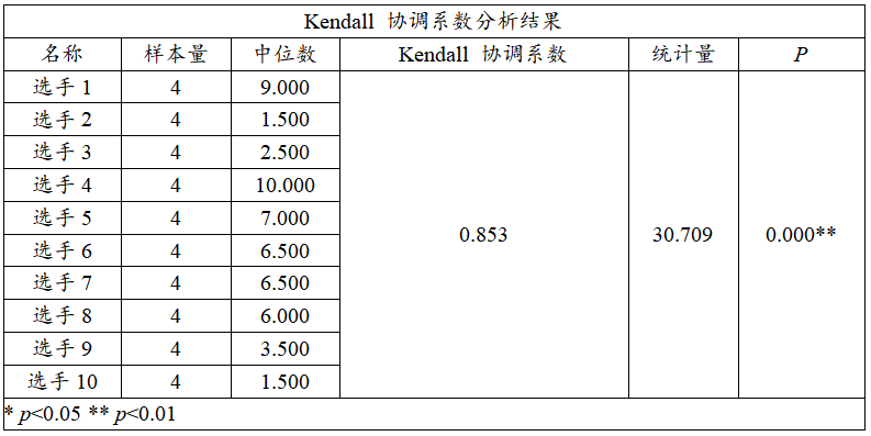 Kendall协调系数用于测量评分数据一致性水平。Kendall协调系数取值在0~1之间,通常情况下:Kendall协调系数 <0.2则说明一致性程度较差;0.2~0.4之间说明一致性程度一般;0.4~0.6之间说明一致性程度中等;0.6~0.8之间说明一致性程度较强;0.8~1.0之间说明一致性程度很强。