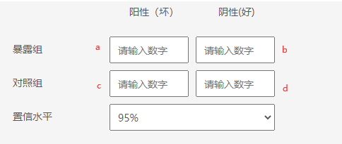 本例子中暴露组中阳性(患病)的数量为20,暴露组中阴性(未患病)的数量是980;对照组中阴性(患病)的数量为5,对照组中阳性(未患病)的数量是995。置信水平默认为95%,操作如下图: