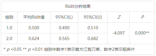 | 组别 | 平均Ridit值 | 95% CI(LL) | 95% CI(UL) | z | p |