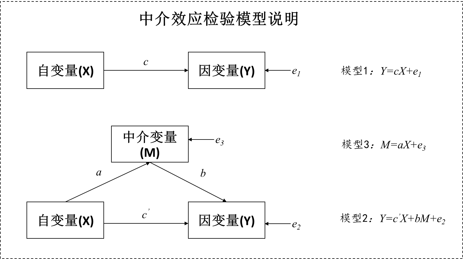 • 模型1:自变量X和因变量Y的回归分析;目的为得到总效应c值;