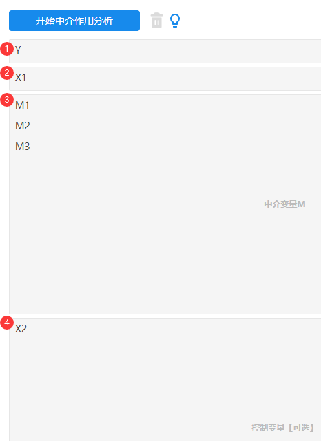 • 如果研究时有这样的模型比如:X->M1->M2->Y;即X先影响M1,M1再影响M2,M2再影响Y;那么此种模型则称为链式中介,分析时下拉选择链式中介参数即可。
