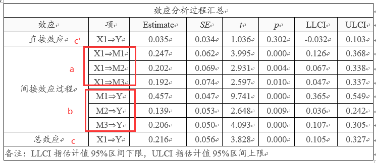 效应分析过程汇总值列出数学模型中的a和b值,即a表格自变量对中介变量的影响值;b表示中介变量对于因变量的影响值;由于本案例中涉及3个中介变量,因此a值为3个,b值也是3个。间接效应共分为三项,分别是X1通过M1,M2或M3再去影响Y。如下表格所示: