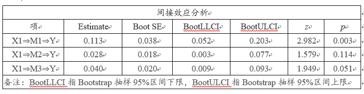 上表格中X1⇒M1⇒Y的回归系数值为0.113,该值ab=0.2470.457。类似的X1⇒M2⇒Y时的回归系数值为0.028=0.2020.139。类似的X1⇒M3⇒Y时的回归系数值为0.040=0.1920.206。