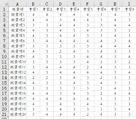 某研究者新设计一份问卷,希望通过专家打分方式来判断其有效性,避免个人主观臆断情况,研究者共设计出20个测量项(即20个题),并且找到8位该研究领域的专家进行打分(专家打分只能为1/2/3/4共4个分值,1分代表较差,2分表示一般,3分表示较好,4分表示良好)并且整理得到数据结果如下图所示。