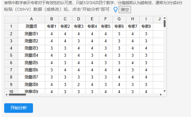 需要提示的是:打分分值只能为1/2/3/4共4个数字,这是由当前算法决定,如果不是这样,系统会提示‘专家打分只能为1/2/3/4分!’。以及第1列测量项的名称可修改为实际的名称,第1行的专家1/2/3等也可修改为实际的专家名称。