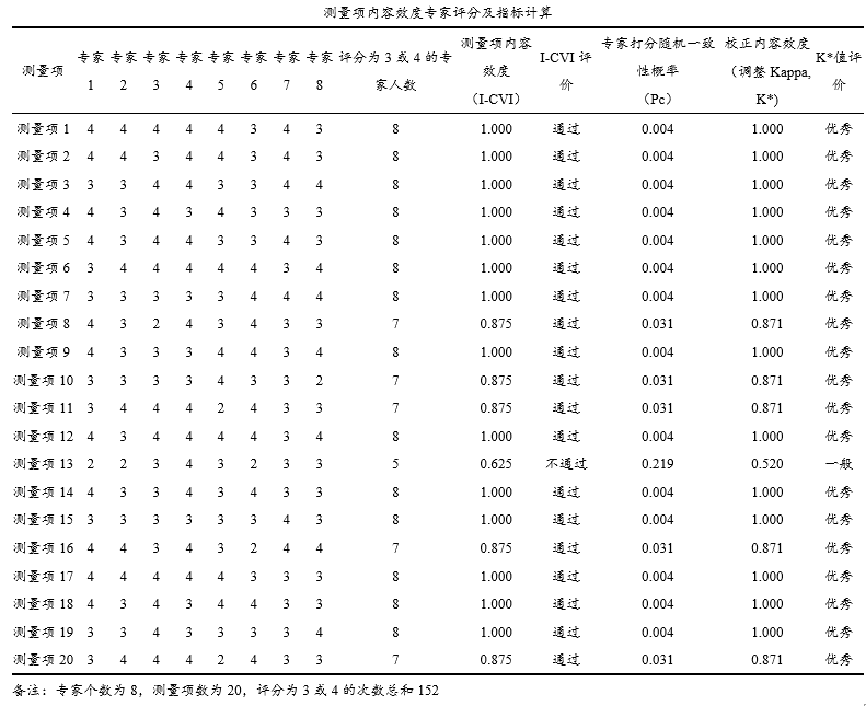 | 测量项内容效度专家评分及指标计算 | 输出I-CVI指标及校正内容效度(调整Kappa值)等,用于每个测量项的内容效度判断 |