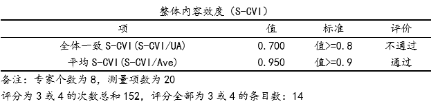 | 整体内容效度(S-CVI) | 输出全体一致S-CVI(也称S-CVI或UA值),平均S-CVI指标值,用于整体内容效度判断 |