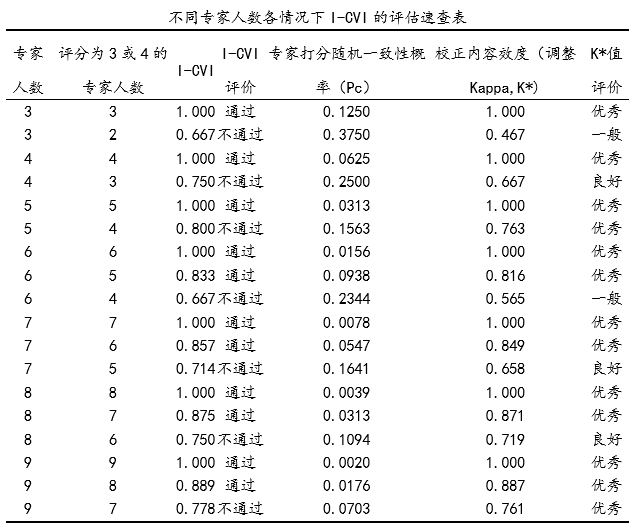 | 不同专家人数各情况下I-CVI的评估速查表 | 其为一个评估速查表,包括3~9个打分专家时的I-CVI合格临界值及调整Kappa合格临界值等信息 |