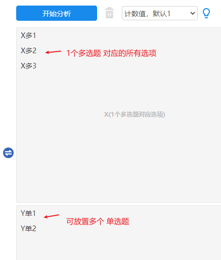 - 多选,单多、多单和多多分析这四个,涉及多选题的分析。每次仅放入一个多选题对应的所有选项,如果有多个多选题则重复分析。