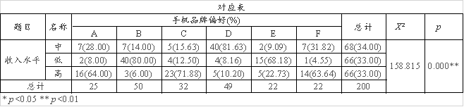 当前希望研究收入水平和手机品牌偏好之间的关系情况,比如收入水平低的人群更偏好A品牌,收入水平高的人群更偏好B品牌。并且使用图形直观展示出来。