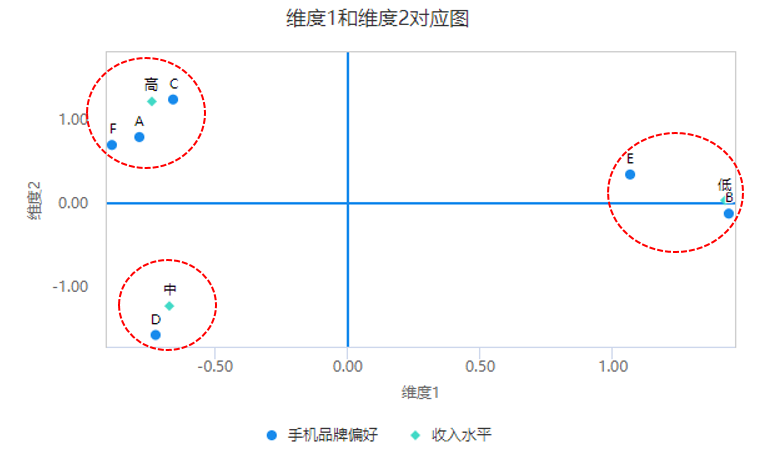 从上图可以看出,低收入群体与手机B、E品牌之间有着较强关系;同时中等收入群体与手机D品牌之间有着较强关系;高收入群体与A、C、F这3个手机品牌之间有着较强关系。通过分析可知:收入与手机品牌偏好之间,可细分出3个市场;低收入群体偏好于B、E品牌手机;中收入群体偏好于D品牌手机;高收入群体偏好于A、C、F三个手机品牌。