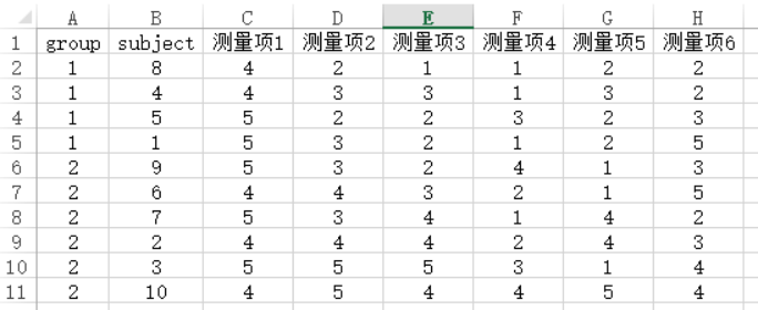 当前有一项关于员工团队合作能力的打分数据,共有10个员工,并且10个员工分成2个组别。关于团队合作能力的评分,其使用6个测量项进行测量(并且使用5级量表打分制)。因而共有10个员工则为10行数据,并且单独使用group来标识组别(1组和2组),6个测量项共计6列。单独还有一列为subject即员工的编号此列数据在分析时不需要使用无分析意义。最终数据格式如下: