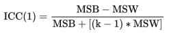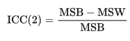 关于ICC1和ICC2的计算公式分别如下,其中MSB表示组间均方,MSW表示组内均方。