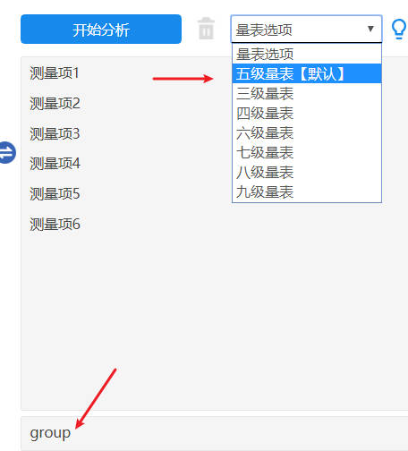 本例子中subject即被打分者共分为2组,由group进行标识,并且打分共由6个测量项表示,测量单位为五级量表,因而操作截图如下: