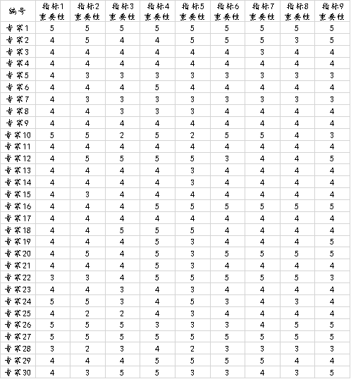 当前有一项关于网购在乎因素的权重研究,涉及网购在乎因素共为9项,分别是指标1,指标2到指标9。然后使用问卷形式让30名专家对此9个指标的重要性进行打分。利用专家打分进行权重计算,得到此9个指标的权重值。