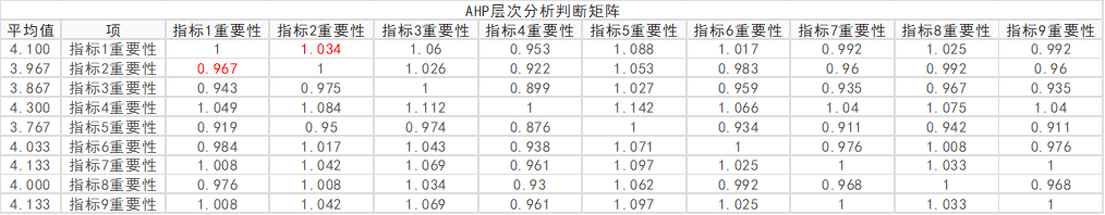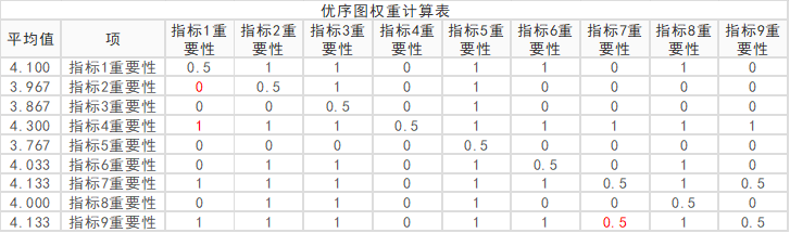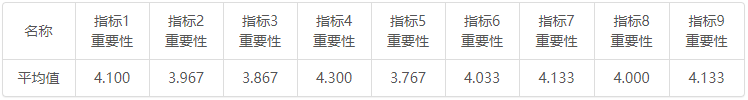上表格中数字0表示相对不重要,数字1表示相对更重要,数字0.5表示一样重要。比如指标2的平均值为3.967,指标1的平均值是4.1,因此指标2不如指标1重要;指标4的平均值为4.3,重要性高于指标1。也或者指标7和指标9的平均得发均为4.133分,因此它们的重要性一样,记为0.5。