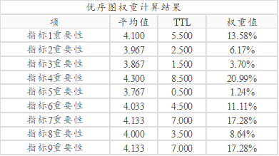 构建完成优序图权重计算表格之后,针对每行进行加和,得到TTL值,比如指标1时TTL值为5.5=0.5+1+1+0+1+1+0+1+0。类似的得到全部指标的TTL值,然后利用TTL值进行归一化处理,最终计算得到9个指标的权重值。