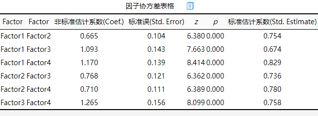 | 因子协方差表格 | 因子之间的关系强弱,辅助判断模型构建情况 | 因子间协方差 |