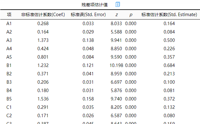 残差项估计值表格,展示出各项的残差估计信息,并不特别意义,有些软件比如AMOS软件会将残差估计值默认展示在模型图中,但SPSSzero当前并没有在模型图中展示残差估计值,如果研究者自行绘制模型图,可使用上表格数据信息进行处理。