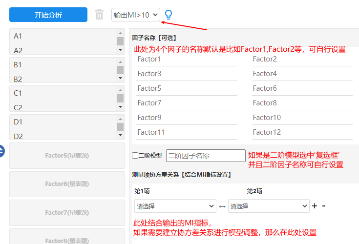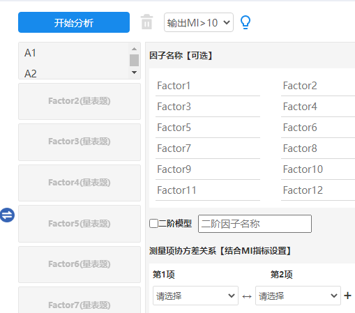 - 进行验证性因子分析时,可在开始分析按钮右侧“MI指标输出”下拉,选择输出MI指标值。如果需要结合MI指标情况进行模型调整,那么可在测量项协方差关系’时设置具体测量项之间的相关关系(协方差关系)即可。MI值越大意味着可减少的卡方值越多,结合该指标进行模型调整时,一般会对卡方自由度值有着较大的帮助。