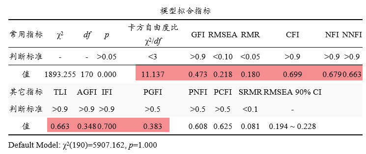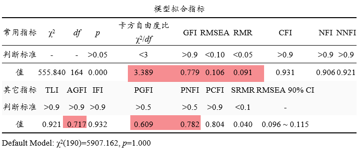 上表格展示模型拟合指标,共分为常用指标和其它指标。常用指标包括卡方自由度比,GFI,RMSEA,RMR,CFI,NFI和NNFI。其它的一些指标通常使用较少,研究人员可结合实际情况进行选择使用即可。