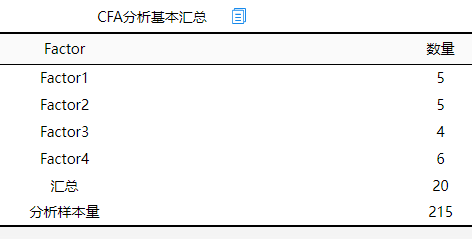 从上表可知,本次针对共4个因子,以及20个分析项进行验证性因子分析(CFA)分析。本次分析有效样本量为215,超出分析项数量的10倍,样本量适中。