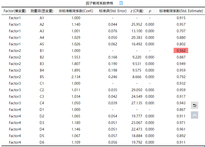 因子载荷系数值表格展示因子和测量项之间的关联关系,一般查看标准载荷系数值进行分析即可。上表格显示,B1与Factor2之间的因子载荷系数值为0.562<0.7,说明对应关系较弱,可考虑将此项从Factor2中移除出去。另外从整体上看,各个测量项全部均呈现出0.001水平的显著性(P<0.001),而且标准化载荷系数值均大于0.7(除B1外),因而说明整体上看,因子与测量项之间有着良好的对应关系,聚合效度较好。另外表格中出现‘-’时意味着该项为参照项因而不会输出。