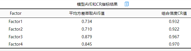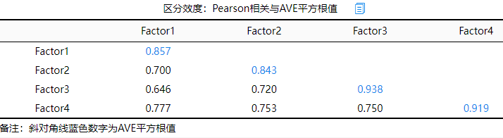 上图的斜对角线为AVE的根号值,比如因子对应的AVE根号值为0.843,该值大于因子1与另外3个因子的相关系数(分别是0.700,0.646和0.777),类似因子2,因子3,因子4也这样进行分析。最终发现因子的AVE根号值,全部均大于该因子与其它因子的相关系数值,因而说明具有很好的区分效度。