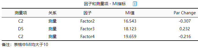 上表格展示因子与测量项的对应关系MI值,因子与其下属测量项的关系可通过因子载荷系数表格进行查看。MI值并不固定标准大小,一般情况下,该值如果大于20则说明关联性很强。从上表格可以看到,C2与Factor2,Factor4这两个因子间的MI指标均大于15,说明C2与Factor2,Factor4之间可能有着较强的关联性;同时,D5与Factor3之间的MI值为18.123,说明二者有较强的关联性。