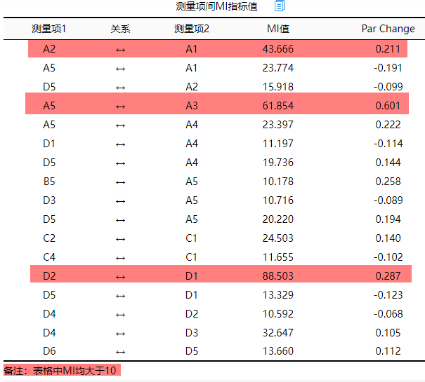 上表格展示测量项间的MI值,其意义为测量项之间的相关关系大小情况。从上表格可以看到,A2和A1,A5和A3,D2和D1这三组之间的MI值很大(此处大和小是相对值,通常结合实际情况综合来回判断没有固定标准),因而如果需要修正模型,可建立该3组之间的‘测量项协方差关系’。