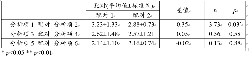 分析项1 配对 分析项2 3.23±1.33 2.88±0.73 0.35 3.73 0.03*